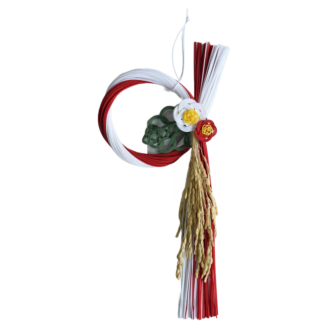 神社等で飾られている注連縄(しめ縄)の小型版に 装飾を加えたものが多く , リースの様に丸めた 輪飾り(ちょろ、輪締め)が主流となっています。 そのノウハウを水引に利用し作成いたしました。